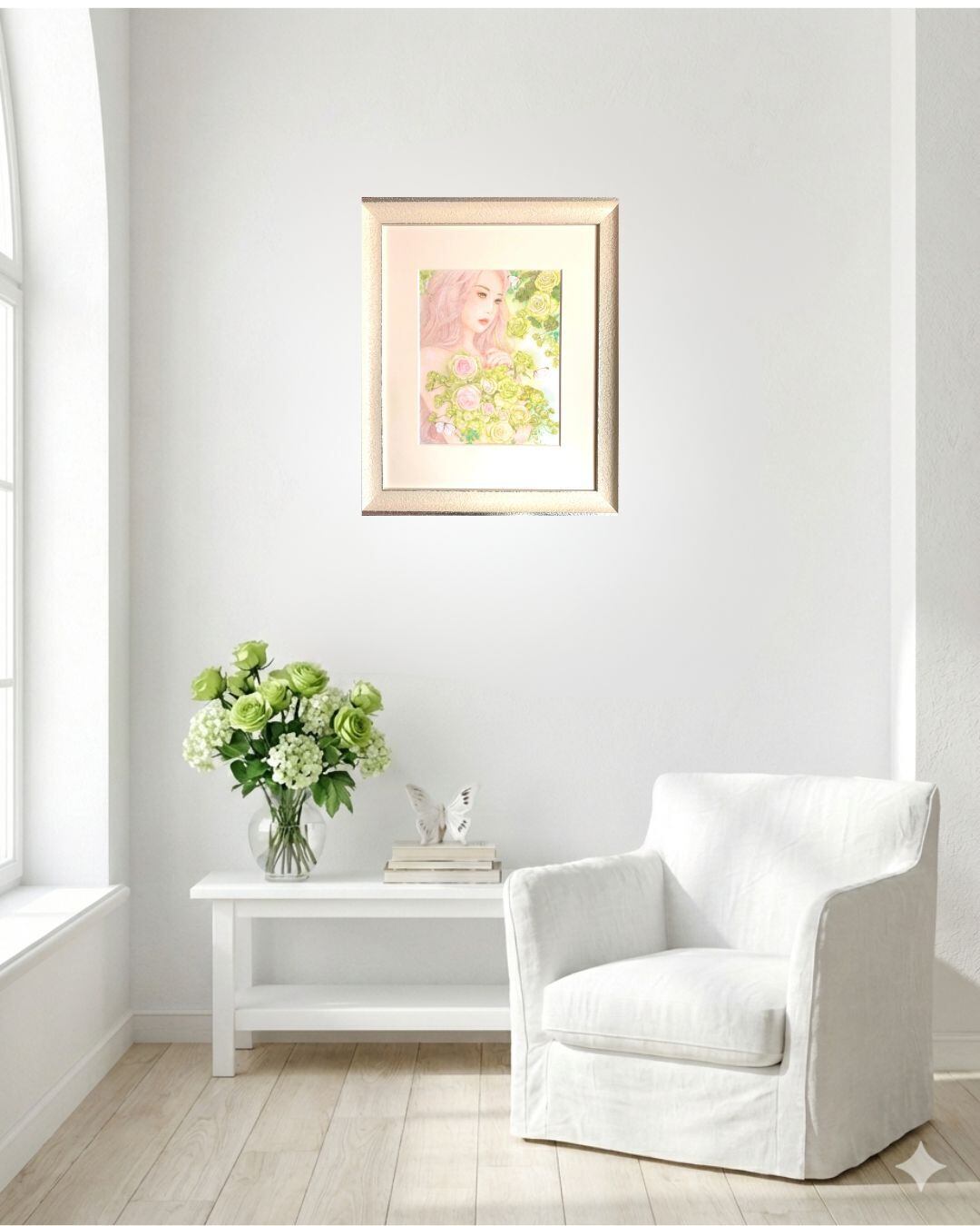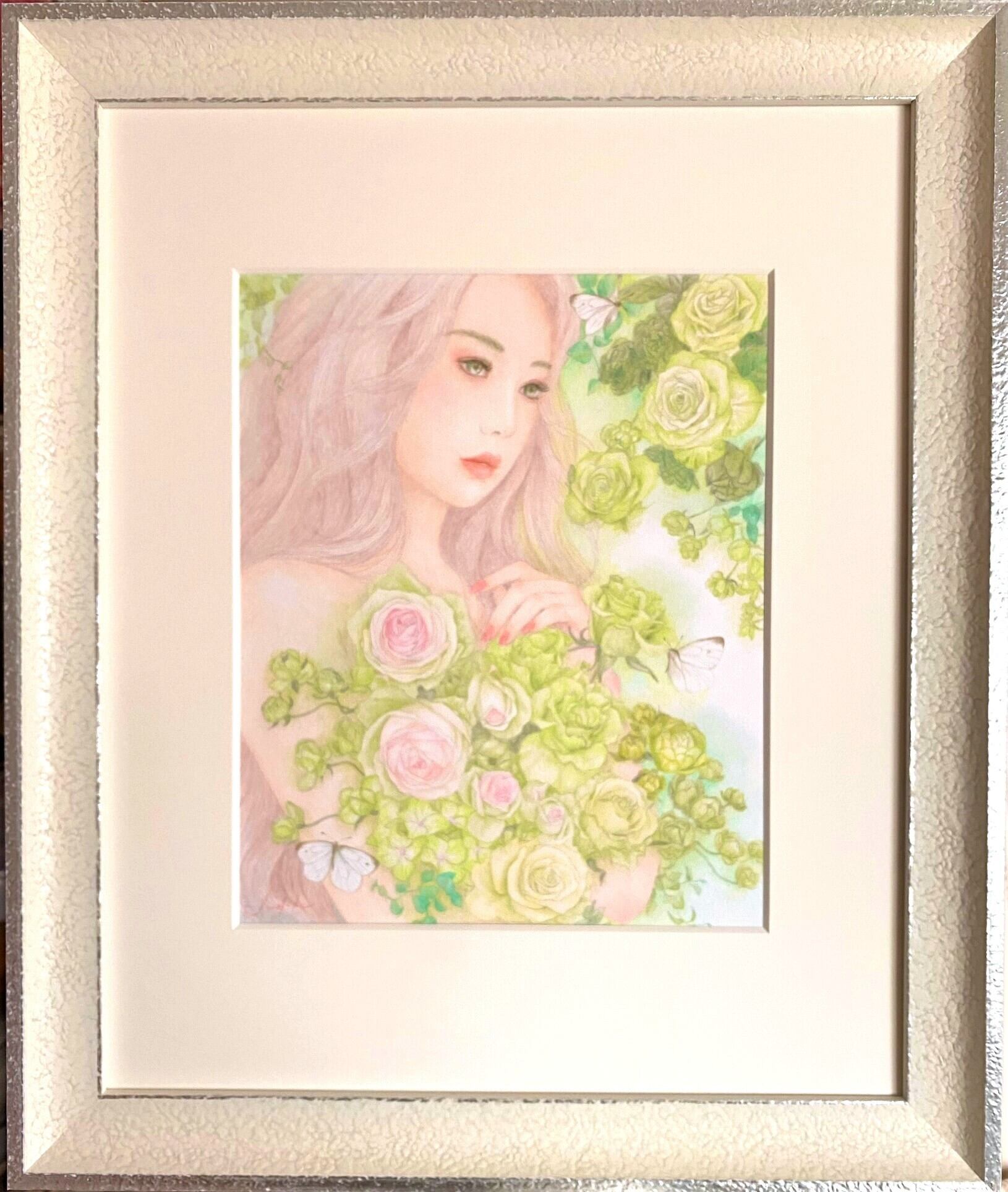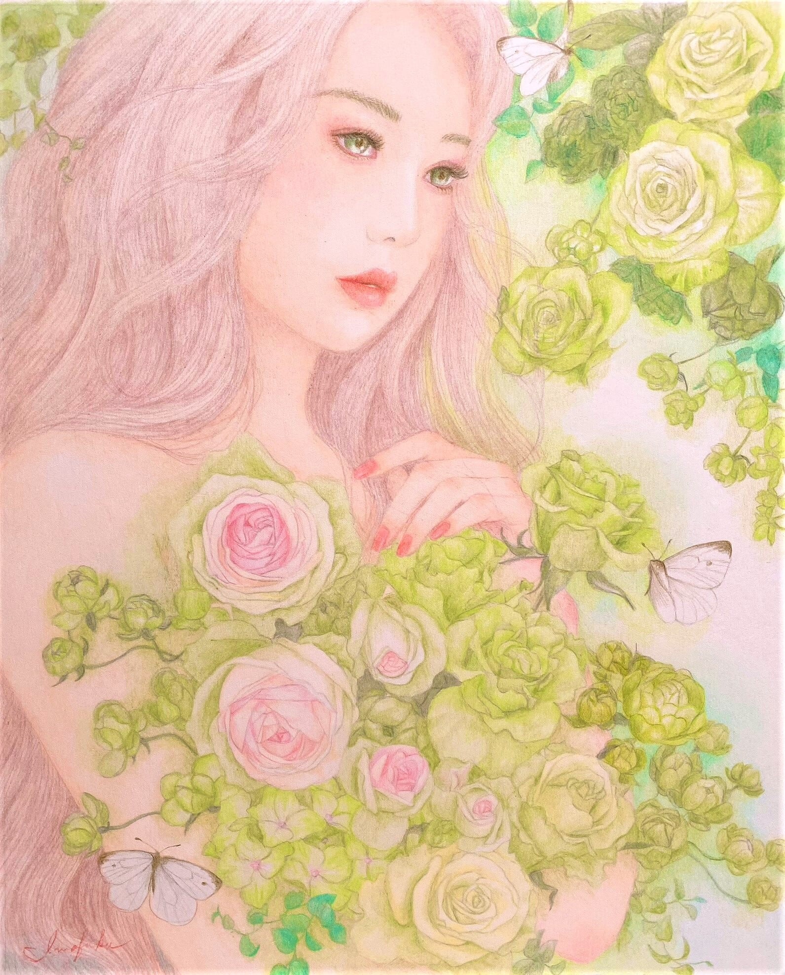 淡いピンクの髪をなびかせる女性と、瑞々しいグリーンの薔薇が織りなすハーモニー。
